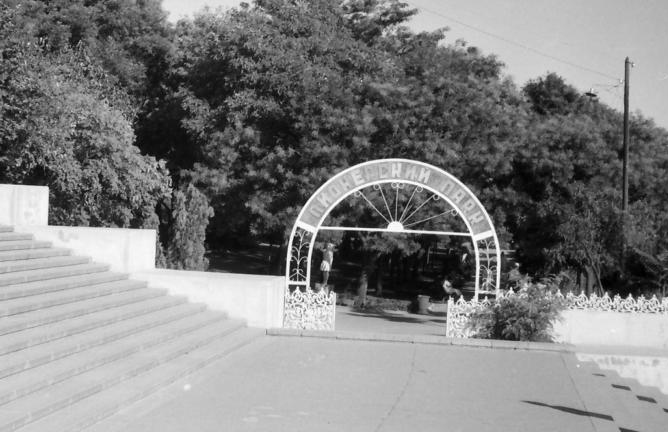 Ещё несколько шагов по плавному спуску, и он понимает, что неожиданно сбоку вышел на Потёмкинскую лестницу – главное чудо Одессы. Он трепетно ступил на широкий пролёт лестницы, раскинувшей вверх и вниз мощные крылья гранитных ступеней: высоко вверху вырисовывается силуэт памятника, внизу улица, белый забор, за ним бурлит напряженной жизнью порт. Прямо, в конце пролёта, арочные ворота. За ними виднеются толстые деревья, аллеи и павильоны, а над входом серебристой дугой из отдельных крупных букв набрано «ПИОНЕРСКИЙ ПАРК».