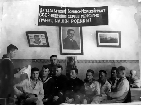 Политинформация в экипаже малого охотника М-11 Каспийской военной флотилии.