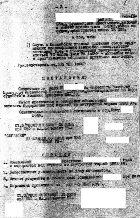 И еще небольшая ремарка. При изучении документов из военно-морского архива, среди прочих, попались интересные (во-первых – с исторической, а во-вторых – с человеческой точек зрения) документы. Для примера приведем два. Они касаются моряка, который служил на катере М-11, историю которого мы и рассматриваем. Не смотря на то, что документы рассекречены, и все разрешенные временные сроки их публикации уже давно прошли – все-таки персональные сведения моряка и всех (кроме одного) лиц, указанных в этих документах затушеваны. Историческая составляющая этого документа – понятна из сути обвинений, предъявленных моряку, а вот человеческая – из сути оправдательного приговора. Одним из членов военного трибунала был Борзенко Георгий Михайлович, который так же, как и обвиняемый моряк, служил на малом охотнике М-11 (именно его фамилия оставлена не затушеванной).