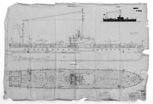 Боковой вид, план палубы и силуэт малого охотника типа МО-IV