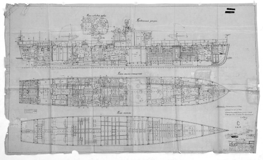 Общее расположение, продольный разрез, трюм малого охотника типа МО-IV