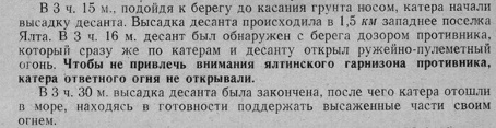 Заканчивая эту главу, приведем еще один документ. Это фрагмент брошюры, выпущенной еще в период Великой Отечественной войны, о десантных операциях Азовской военной флотилии. Во всех этих операциях участвовал малый охотник СКА-0412. Это документ, написанный сухим, военным языком – время, направление ветра, задача, допущенные ошибки и так далее. В таких документах практически нет фамилий, нет красочного описания боев, нет подвигов – только факты. Но одна фраза в этом документе, в описании десанта в районе населенного пункта Ялта, просто потрясающая. Она выделена в тексте более жирным шрифтом.