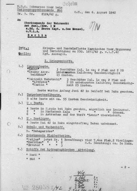 Документ разведывательного отдела немецкого морского командования "Юг" на Черном море от 6 августа 1942 года, который опираясь на эту аэрофотосъемку, определил состав Каспийской военной флотилии. Приведем первую страницу этого документа. Под пунктом 4 (U-Boot jäger. 4 Boot May 42 in Baku eingetroffen) на ней как раз указаны малые охотники (среди них, конечно же, был и М-11).