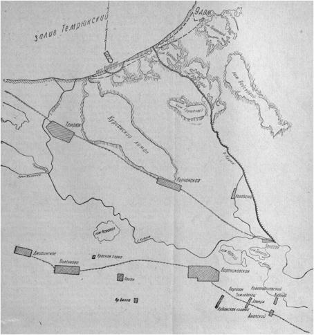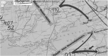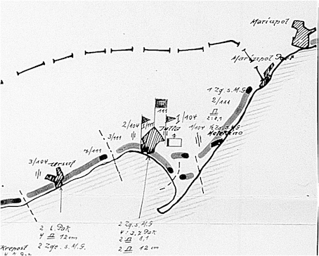 Фрагмент оперативной карты группы армий «Юг» с расположением частей 24-й румынской пехотной дивизии на побережье Азовского моря 30.05.1943 г.