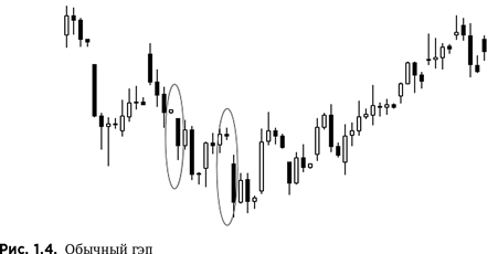 ГэпыКак уже было сказано, тайм-фреймы являются следующими друг за другом интервалами времени. Однако далеко не все рынки функционируют круглосуточно. Периоды, во время которых торги не проводятся, на графиках не отображаются. Соответственно, например, для рынка российских акций за баром, закрывшимся в 18:45 предыдущего дня (на срочном рынке торги заканчиваются в 23:50), сразу последует бар, начинающий отсчет своего интервала с 10:00 нового дня. Но, поскольку жизнь с закрытием рынков не останавливается и в глобальном мире финансов продолжают происходить различные события, утренние настроения трейдеров могут сильно отличаться от вчерашних. В результате цена открытия нового дня может существенно отличаться от цены закрытия дня предыдущего. В этом случае на графике образуется заметный ценовой разрыв: резкий переход цены на новый уровень без промежуточных сделок, который принято называть гэпом[1].