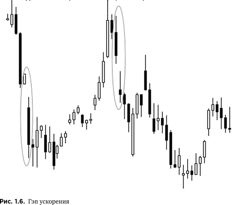 Гэп ускорения встречается в середине ценового движения при повышенном интересе трейдеров к инструменту. Он указывает на более вероятное продолжение движения цены в текущем направлении.