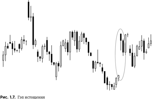 Гэп истощения обманчив тем, что похож на предыдущий тип, но по своему характеру напоминает предсмертные конвульсии текущего рыночного движения и указывает на предстоящий разворот ценовой динамики. В этот момент трейдеры ошибочно полагают, что движение будет продолжено, и совершают активные сделки в прежнем направлении. Цена реагирует на это резким скачком, который происходит на последнем издыхании. Поэтому такую модель на жаргоне трейдеров еще называют «прыжок дохлой кошки». Этот гэп сопровождается очень высоким объемом торгов.