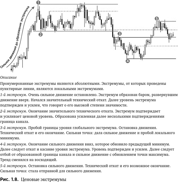 Как уже было сказано, даже трендовое движение происходит не прямолинейно. При сохранении основного направления цена может откатываться в сторону, противоположную основному движению, образуя коррекции. Поэтому принято считать, что тренд – это совокупность последовательно повышающихся ценовых минимумов и максимумов в случае восходящей тенденции и, соответственно, последовательно понижающихся максимумов и минимумов при нисходящей тенденции. Такие достигаемые ценой максимумы и минимумы называют экстремумами. При этом различают глобальные экстремумы – абсолютно максимальные или абсолютно минимальные значения цены, достигнутые и не превзойденные за долгий промежуток времени, и локальные экстремумы – максимальные или минимальные значения цены на средне- и краткосрочном промежутке времени, но не превосходящие по своей величине ценовых значений глобальных экстремумов.