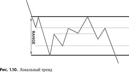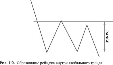 На рис. 1.9 представлен схематический пример образования бокового движения (рейнджа) внутри нисходящего глобального тренда. В данном случае ограниченный горизонтальными линиями канал был создан коррекционным движением цены биржевого актива после ее стремительного снижения. Поэтому, несмотря на то, что последние движения цены происходили в боковом диапазоне, можно считать, что на глобальном уровне тренд остается медвежьим (направленным на понижение).