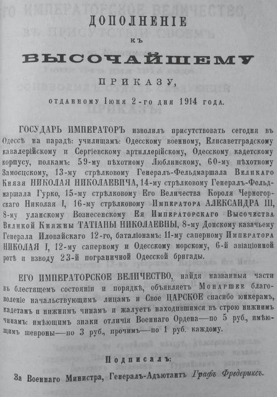 А потом был парад войск Одесского гарнизона, порадовавший всех, кто стал свидетелем этого зрелища. По результатам его Николай II подписал Высочайший приказ, в котором отметил прекрасное состояние полков, в нём участвовавших и наградил всех нижних чинов.
