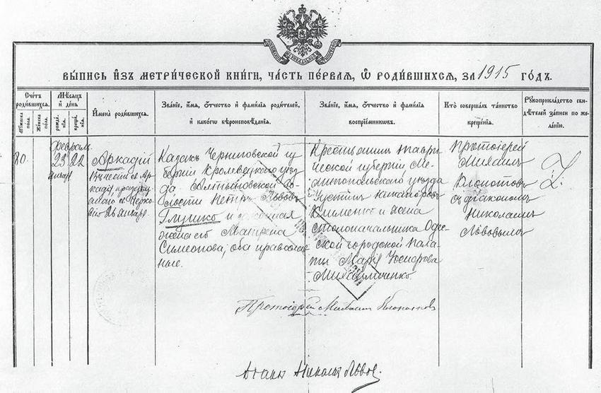 В 1915 г. семья Глушко пополнилась вторым сыном Аркадием. 22 февраля (6 марта) дьяконом Алексеевской церкви на Молдаванке в метрической книге была сделана запись под № 80 о том, что 23 января (4 февраля) родился мальчик Аркадий, названный так в честь святого Аркадия, празднуемого церковью 26 января (7 февраля). «Родители: казак Черниговской губернии, Кролевецкого уезда, Алтыновской волости Петр Львов Глушко и законная жена его Матрона Симеоновна, оба православные… … …Таинство крещения совершено протоиреем Михаилом Клоповым с диаконом Николаем Львовым».