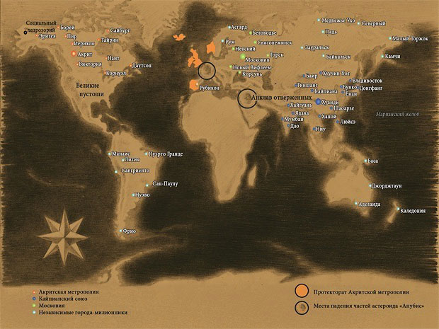 * * *К началу 2700 года на планете образовались две крупные влиятельные агломерации с централизованным управлением. Первая располагалась на севере американского континента и называлась Акритская метрополия – по имени столицы Акрит, где были сосредоточены все властные структуры. Вторая агломерация – Кайпианский союз, раскинулась вдоль юго-восточного побережья Азии. Управляемый Верховным Советом из гигантского подземного города Хуанди Кайпианский союз конкурировал с Акритской метрополией, создавая локальные конфликты в различных регионах мира, где еще оставались богатые залежи полезных ископаемых. Борьба за богатства Антарктики, территория которой частично освободилась от ледяного покрова, усилила их противостояние. Остальные очаги цивилизации, различные кочующие и оседлые племена, возникшие на развалинах Паноптикума, были слабы и предпочитали сохранять нейтралитет, поддерживая лишь дипломатические и торговые отношения с гегемонами.