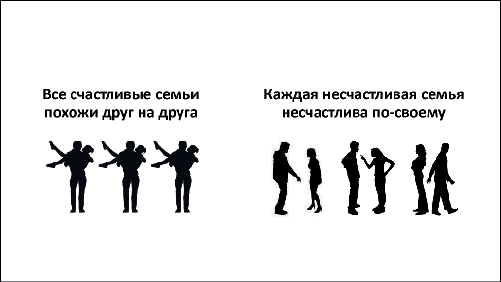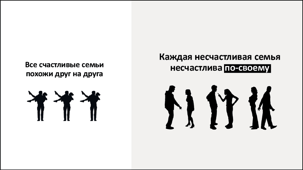 Где бы в реальной жизни толстовская цитата могла появиться? Например, в докладе студента-психолога или популярной лекции психотерапевта, работающего в центре семейной терапии. Допустим, наш вымышленный спикер хочет рассказать о том, что разным парам в зависимости от их проблем и типов личности подходят разные психотерапевтические школы и техники. Кому-то – когнитивно-поведенческая, кому-то – гештальт-терапия, а кому-то – транзактный анализ. Фраза, которую он выбрал для начала разговора, безусловно, вызовет понимающую улыбку у слушателей. Но как сделать слайд выразительнее, интереснее?