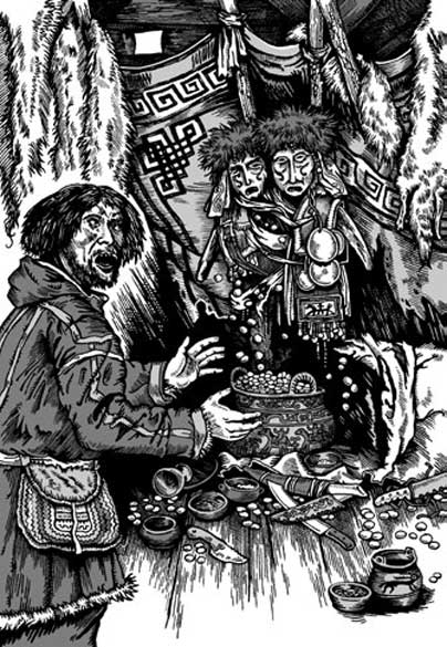 Сидя на порожке чомьи, Чумпин вполголоса беседовал с богом. Ничего особенного не произошло. От долга они с отцом увиливать не собираются. Пригоршню серебра очень хорошо помнят. Можно же немножко подождать. Деньги будут скоро. А пока вот прими это: Чумпин достал из-за пазухи огниво. Без огня трудно будет в пути, но что ж делать? Дарить – так то, что жалко. Положить в чашу постеснялся, сунул огниво в складки выцветших тканей на идоле.