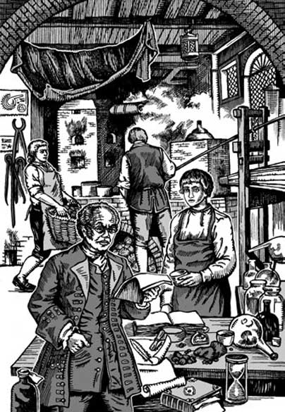 У одной стены стояли три пробирные печи с ручными мехами для дутья. У другой – две тумбы с весами пятифунтовыми, для грубого веса, и аптекарскими – под стеклом, для малых навесок.