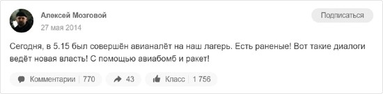 Пост Алексея Мозгового на личной странице в «Одноклассниках» 13 марта 2014. (ok.ru/profile/551539700856) Во время восстания и летнего периода войны Мозговой оставлял записи только на ok.ru, а в начале сентября открыл страницу ВКонтакте.