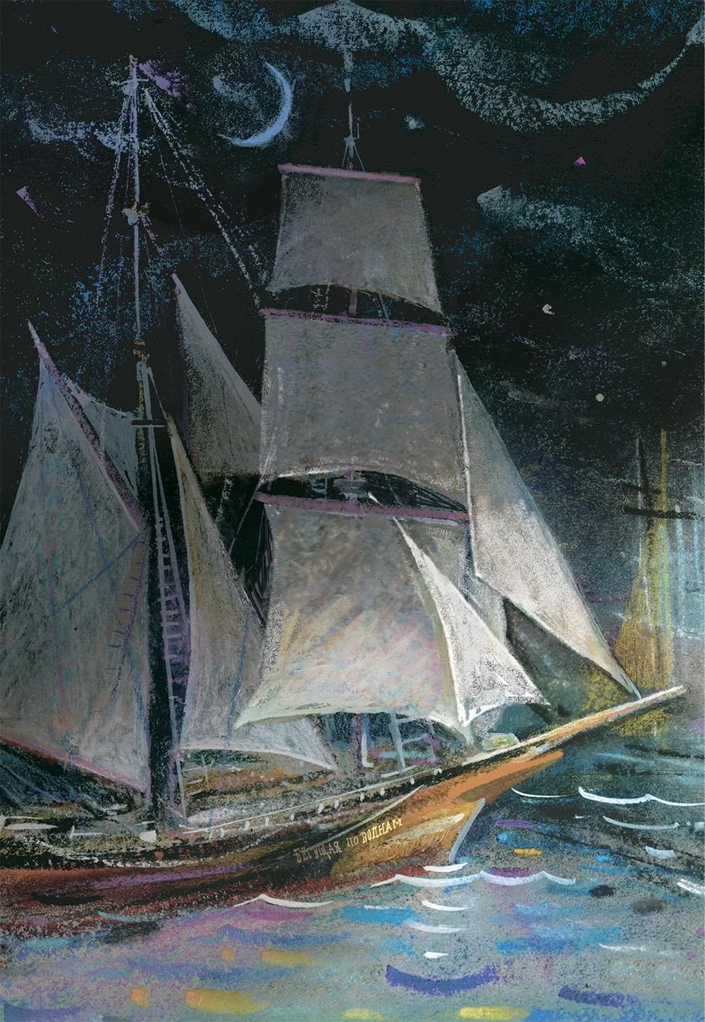 Наконец, настойчиво отведя эти чувства, как отводят рукой упругую, мешающую смотреть листву, я стал одной ногой на кормовой канат, чтобы ближе нагнуться к надписи. Она притягивала меня. Я свесился над водой, тронутой отдаленным светом. Надпись находилась от меня на расстоянии шести-семи футов. Прекрасно была озарена она скользившим лучом. Слово «Бегущая» лежало в тени, «по» было на границе тени и света, и заключительное «волнам» сияло так ярко, что заметны были трещины в позолоте.