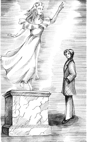 Поднявшись к пересекающей эту улицу мостовой, я снова попал в дневной гул и ночной свет и пошел влево, как бы сознавая, что должен прийти к вершине угла тех двух направлений, по которым шел вначале и после. Я был на широкой, залитой асфальтом улице. В ее конце, бывшем неподалеку, виднелась площадь. Туда стремилась толпа со всего переулка. Через головы, перемещавшиеся впереди меня с быстротой схватки, я увидел статую, возвышавшуюся над движением. Это была мраморная фигура женщины, с приподнятым лицом и протянутыми руками. Пока я проталкивался к ней среди толпы, ее поза и весь вид были мне не вполне ясны. Наконец я подошел близко, так, что увидел высеченную ниже ее ног надпись и прочитал ее. Она состояла из трех слов: