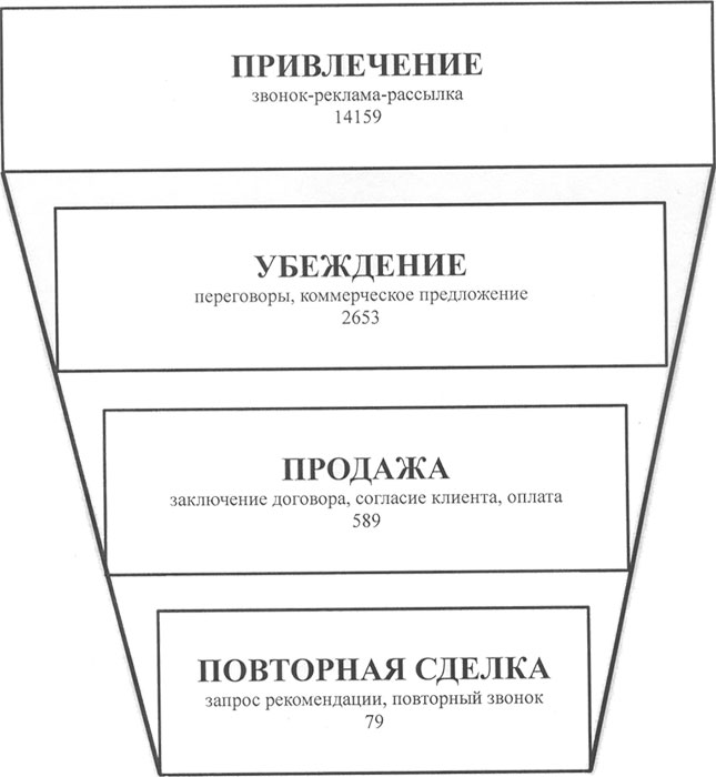 Цель продавца – заключить сделку, общение с покупателем – это средство продажи. Чем меньше времени и энергии продавец затрачивает на заключение сделки, тем выше прибыль. Для сокращения ошибок при общении с клиентом по достижении цели продажи разбивают на этапы, которые можно контролировать и анализировать для эффективности. Для анализа и корректировки чаще используют период в рабочую неделю: день не дает полной картины предпочтений покупателей, месяц – долгий срок, по истечении которого среднестатистический человек забывает часть событий и реакцию на них, что не позволяет их анализировать. Из этапов продаж образуется воронка продаж, путь клиента от первого контакта с Вами до заключения сделки.