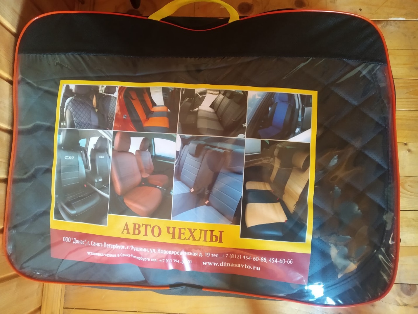 Ранее я писал, что покупатели не отличают одни чехлы от других, даже не смотря на производителя, когда покупают. А когда заказывают установку, то даже не видят упаковку. Это приводит к тому, что при следующей покупке, невозможно определить, что же была за фирма чехлов, которые понравились. Пришло время это исправить. В первую очередь рассказываю, как отличить чехлы фирмы "Динас". Первое, что бросается в глаза – упаковка. Это чехол (да-да, чехол для чехла), с одной стороны прозрачный, с другой – тканевый. С лицевой прозрачной стороны всегда вложена инструкция по установке. На фотографии вы видите ее оборотную сторону с фотографиями моделей и расцветок, а также с адресом и телефонами.