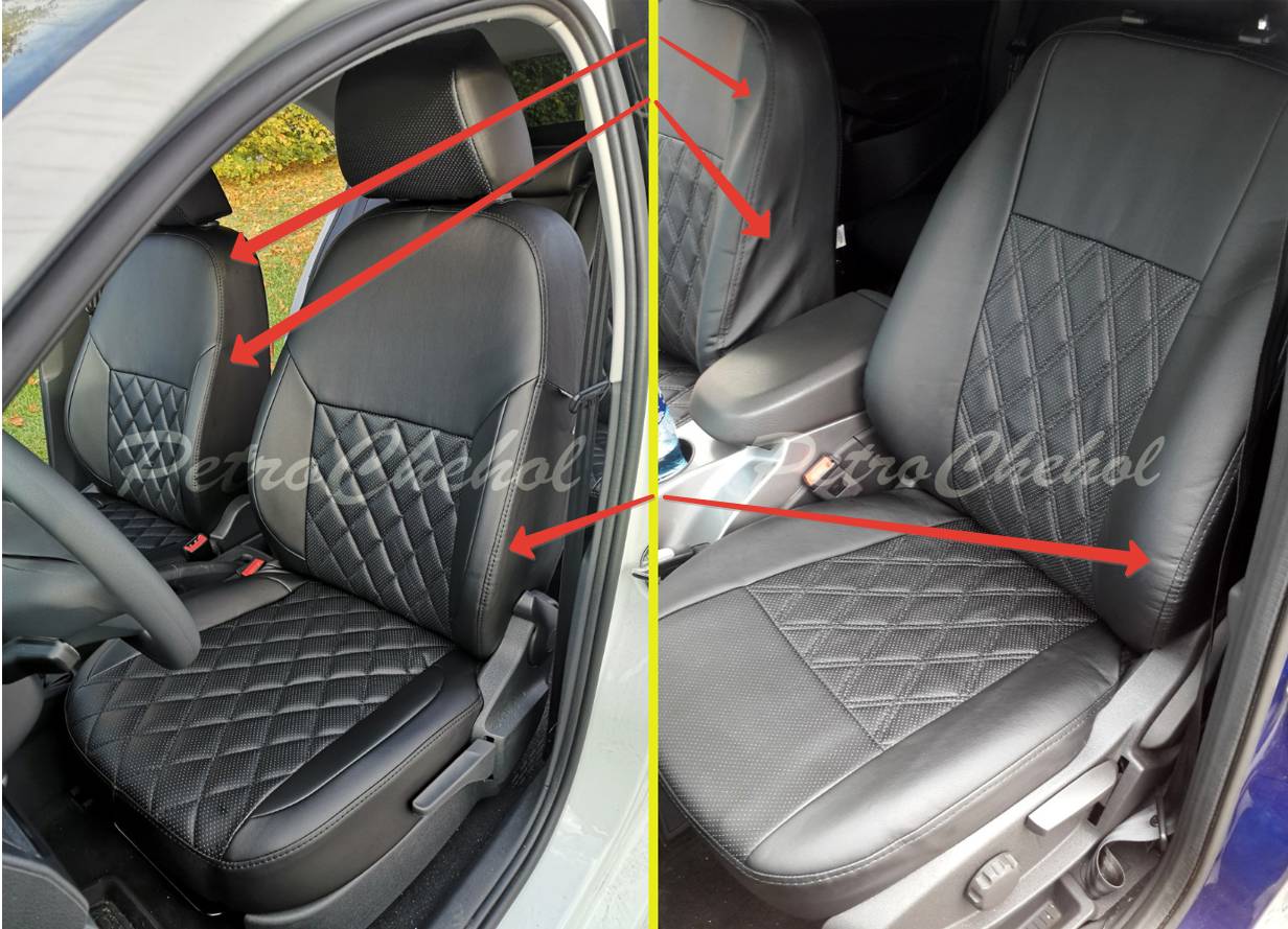 Получается, что необходимость в защите и долговечности чехла есть только на основных местах эксплуатации – сидушках и спинках сиденья. Этот нюанс учитывает конструкция чехлов. Поэтому на месте, где контакт происходит чаще всего и где сиденье подвержено износу (сидушка и спинка) ставится плотная экокожа.