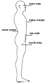 Рис. 1. Пятеричная схема: инь-тан, тань-чжун, ци-хай, мин-мэнь, хуэйчшь; даосская схема трех даньтяней: голова (инь-тан), грудь (тань-чжун), промежность (хуэй-инь)