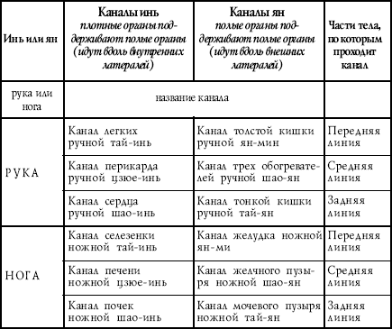 Существует двенадцать обычных каналов – Двенадцать Каналов, ведущих к плотным и полым органам. Их природа выражается терминами инь и ян. Соединяющиеся с плотными органами и идущие вдоль внутренний латералей тела называют каналами инь. Соединяющиеся с полыми органами и идущие вдоль внешних латералей тела называются каналами ян. Согласно природе внутреннего органа и маршрутам следования они далее классифицируются следующим образом: три инь-канала руки, три ян-канала руки, три инь-канала ноги и три ян-канала ноги (табл. 1).
