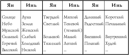Все то, что можно отнести к сильному, горячему, твердому, тяжелому, высокому, блестящему, а также те или иные весомые признаки – это ян, а все противоположное – инь. Так деятельность и покой, свет и тьма, возбуждение и торморжение, неосязаемость и телесность и многие другие пары взаимопротивоположных явлений, предметов и свойств могут быть восприняты с позиции концепции инь – ян как единство и борьба двух противоположностей, или «полярных сил» – ян (активная сила) и инь (пассивная сила). При этом ни ян, ни инь не могут существовать изолированно друг от друга.