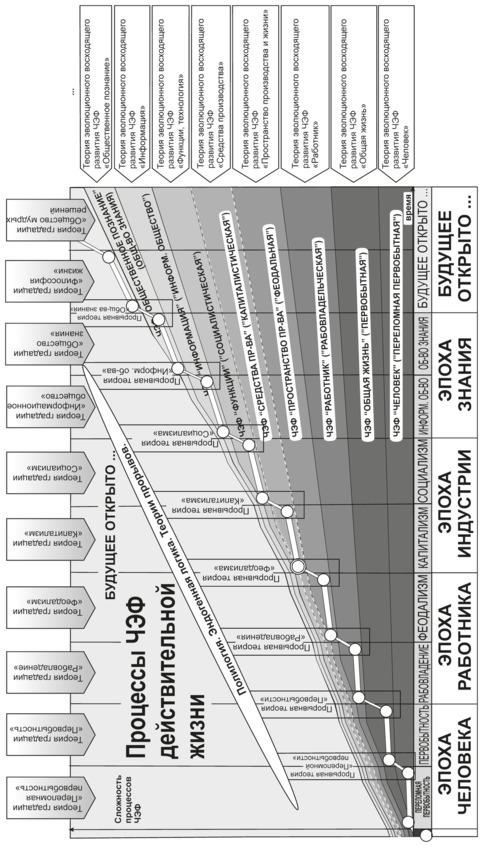 Так, например, забегая несколько вперёд, на схеме рисунка 25 было представлено восходящее движение каждой из «внеисторических, непреходящих базовых ценностей», как базовых типологических объектов, по историческим ступеням, можно сказать, «вещественно-продуктового мира человеческого бытия». Эти исторические ступени восхождения человеческого общества от переломной первобытности, через капитализм и социализм, до Общества мудрых решений и далее, – будущее открыто. Каждый шаг этого восхождения в реалиях действительной жизни неразрывно связан с переидеологизацией, с доминированием всё новых и новых «внеисторических, непреходящих базовых ценностей».