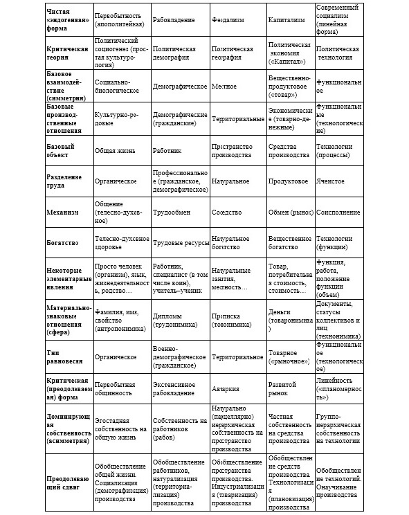 «… мы имеем пока самое общее представление об эндогенной логике – об ее эмпирическом корреляте как главной последовательности исторически новых критических форм и прорывов (не «формаций»! ): первобытность, рабовладение, феодализм, капитализм («вульгарный»), линейная (плановая) форма, где каждая из этих форм – пока только еще ничего не значащий ярлык обозначения некоторого идеально чистого критического состояния и восходящего, преодолевающего это состояние тренда (кроме теоретически известного «вульгарного» капитализма середины позапрошлого века)» [43, с. 1].