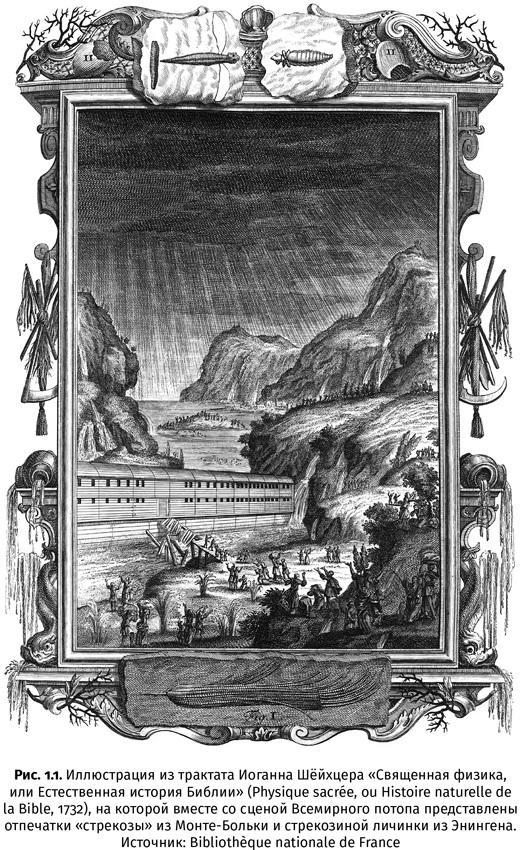 Шёйхцер принадлежал к числу наиболее известных сторонников дилювианизма (от лат. diluvium – «потоп»). Так называлось учение, связывавшее возникновение ископаемых остатков со Всемирным потопом, который якобы уничтожил допотопную флору и фауну и засыпал ее многометровыми слоями песка и глины. В результате этого катаклизма, полагал Шёйхцер, и образовались камни с отпечатками насекомых, а также все остальные окаменелости. Неслучайно в «Священной физике» изображения комара-долгоножки из Монте-Больки и стрекозиной личинки из Энингена украсили виньетку, обрамляющую драматическую сцену с Ноевым ковчегом. На ней можно видеть, как неподалеку от ковчега под проливным дождем в отчаянии мечутся толпы грешников, обреченных на верную смерть. За насекомыми, как и за грешниками, место в ковчеге Бог не зарезервировал. Во всяком случае, так считал немецкий иезуит Афанасий Кирхер, старший современник Шёйхцера и не менее выдающийся деятель раннеевропейской науки. Дилювианистские воззрения заставили Кирхера полемизировать с итальянцем Франческо Реди, чьи эксперименты с гнилым мясом и мушиными личинками впервые поставили идею самозарождения жизни под сомнение. Ведь если насекомые не могут самозарождаться из ила и грязи, то как же они восстановились после потопа? – вопрошал Кирхер…