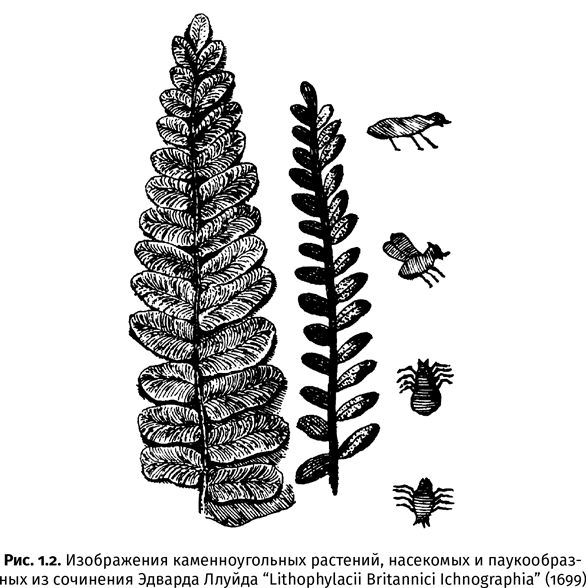 Представление об окаменелостях как об игре природы, не имеющей реального отношения к организмам прошлого, продержалось вплоть до конца XVII в. В этом мы можем убедиться, листая “Lithophylacii Britannici Ichnographia” – каталог коллекции окаменелостей Эшмоловского музея в Оксфорде, изданный в 1699 г. ее хранителем Эдвардом Ллуйдом при поддержке Исаака Ньютона и других видных деятелей науки того времени. В теоретической части каталога Ллуйд писал, что окаменелости зарождаются в трещинах скал из микроскопических частиц животного и растительного происхождения, так называемых animalcula, которые вместе с водяным паром поднимаются из океана и затем с каплями дождя просачиваются в землю. Сочинение Ллуйда интересно и тем, что в нем фигурируют первые в истории науки изображения ископаемых насекомых и паукообразных (рис. 1.2). Выполненные в довольно топорной манере, они помещены на той же ксилографии, что и образцы каменноугольной флоры, собранные в окрестностях английского города Глостера. Тем не менее точное место, где были найдены отпечатки насекомых, Ллуйд не указал, вероятно, посчитав, что такая безделица не заслуживает серьезного отношения.