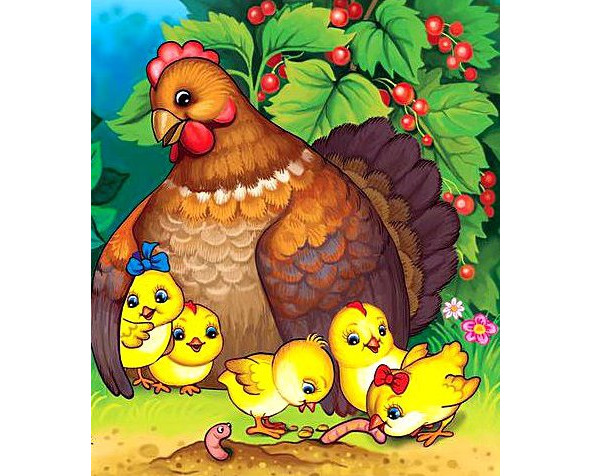 По двору за клушкой ходятдесять маленьких цыплят.Золотистый и весёлыйэтот маленький отряд.Всюду следуют за мамойотстать вовсе не хотят.Как найдут еду какую,сразу кучей налетят.Погулять выводит клушкасвоих маленьких цыплят.Ну а те довольны очень,только радостно пищат.Коль цыплята разбегутся,чтоб немного поиграть.Очень трудно будет мамеснова вместе их собрать.
