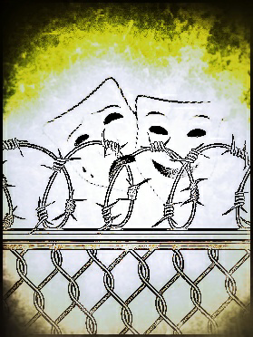 Деревянный барак. В бараке вдоль стен – нары в два этажа. На нарах, свесив грязные, волосатые ноги – измождённые, обритые наголо зэки. Щерятся беззубыми ртами, растопырив пальцы в синих “перстнях”. На плечах – “звёзды”. На груди и спинах – “купола”. В пальцах – чётки, слепленные из чёрного хлеба. На столе-общаке – алюминиевые мятые и чёрные от копоти кружки ("кругали") с чифиром да замусоленная колода самодельных карт. И под дребезжание разбитой, расстроенной гитары хором, заунывно, раз-два: “Таганка, все ночи полные огня! Тага-а-анка, за-а-ачем сгубила ты меня-а-а…”. А под нарами, трепеща от страха, прячется “опущенный”, прикрывая зад старой драной телогрейкой…