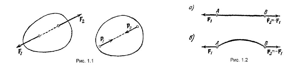 аксиомы непосредственно следует, что действующие на такой стержень силы направлены вдоль прямой, проходящей через концы стержня, противоположны по направлению и равны друг другу по модулю (рис. 1.2, а). Этот вывод сохраняется и в случае, когда ось стержня криволинейна (рис. 1.2, б).