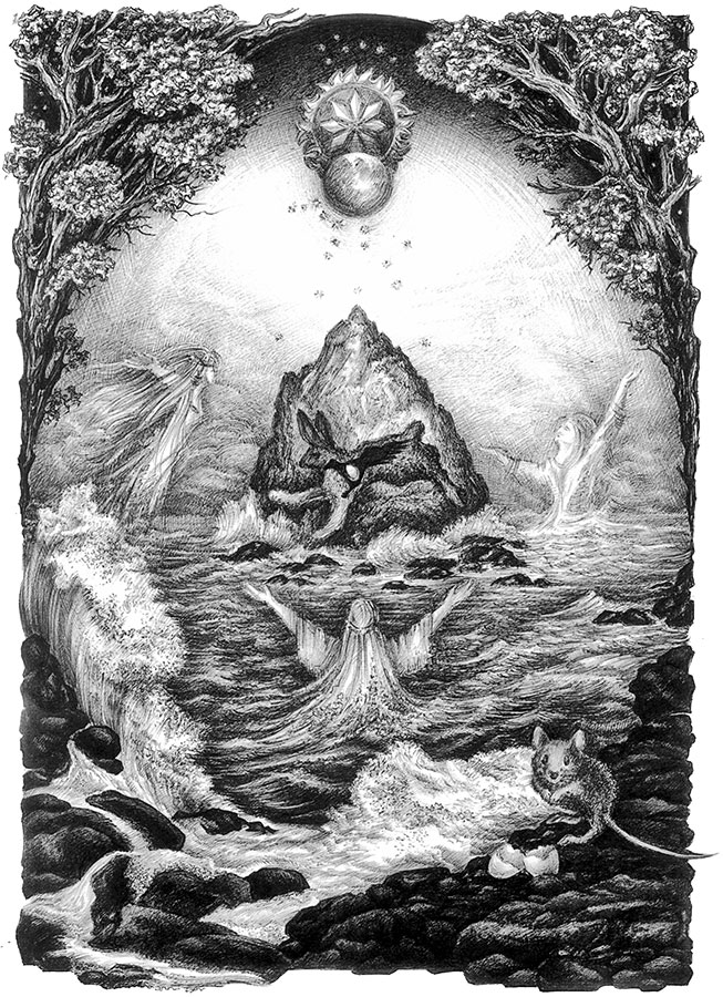 В начале мира не было ни неба, ни земли, а только Многоглазая пучина – всесветлое, безбрежное Море-океан, которое одновременно являлось и беспредельным небом. Море-океан породило самых первых богов: Стриба – деда ветров, Йесу – владыку моря, Подагу – богиню погоды и Цизу – богиню плодородия, а также многочисленных духов: злых – упырей, сестер-лихорадок и добрых – русалок и берегинь.