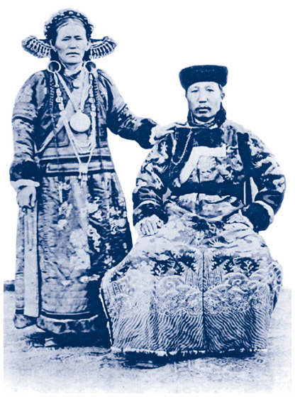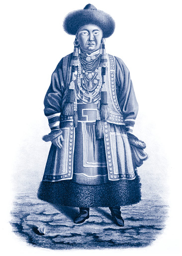 Бурятка в праздничном одеянии. Литография Л. Немировского из альбома «Путешествие по Восточной Сибири», 1856 г.