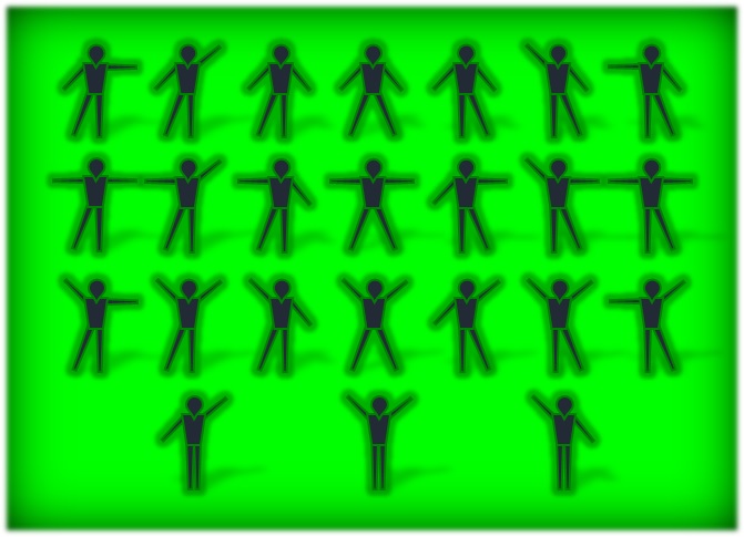 На следующих картинках приведены альтернативные способы изображения или озвучивания буквицы. При помощи точек и двоеточий (тире), пятиполосной перфорации, фигурной раскладкой, цветовыми сочетаниями, положениями кисти руки, посредством мимики и жестов, посредством пар музыкальных нот, поворотом кубика или раскладкой палочек.