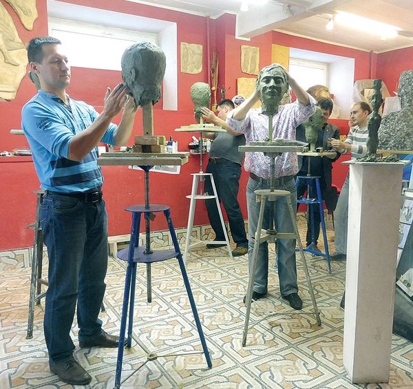 Рисунок 4. Группа мужчин в процессе создания скульптурных портретов в мастерской.