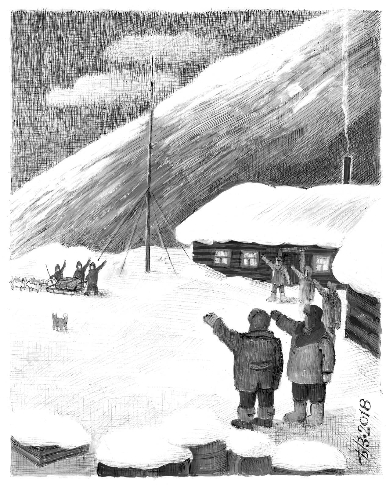Ветер достиг ураганной силы. На месте груза лежал только металлический бур; дрова и палатка отнесены ветром к ближайшим торосам. Среди торосов мы отыскали место, где ветер был значительно тише; с большим трудом установили и закрепили палатку и, не разжигая огня, вскрыли по банке мороженой тушенки, наспех поели и залезли в спальные мешки. А Данилычу еще нужно было накормить собак. Когда каюр закончил свое дело, мы спали.