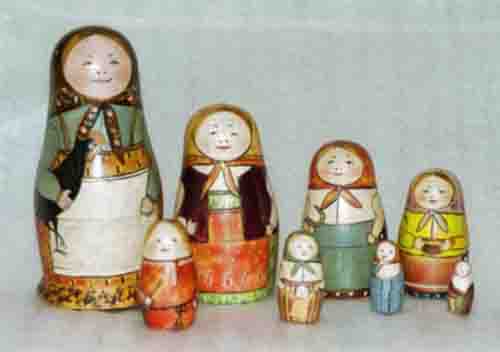 Достаточно характерна история русской матрёшки. Матрёшка родилась в мастерской-магазине "Детское воспитание", принадлежавшей супругам Мамонтовым. В 1899 году её выточил токарь Звёздочкин, который увидел в журнале японскую куклу (предположительно – мудреца Фукуруму). Сначала кукла не раскрывалась. Эта идея пришла в голову уже другим мастерам. А автором идеи росписи был художник С.В. Малютин. В 1900 году, на Всемирной выставке в Париже, матрёшка завоевала общее признание, после чего к процессу подключились другие мастера. Вот и появился национальный символ, который в мире считают традиционным старинным русским изделием.