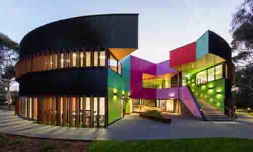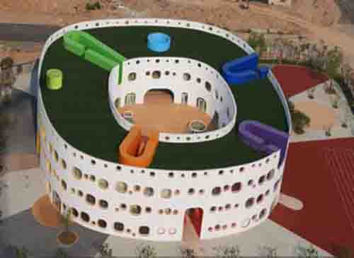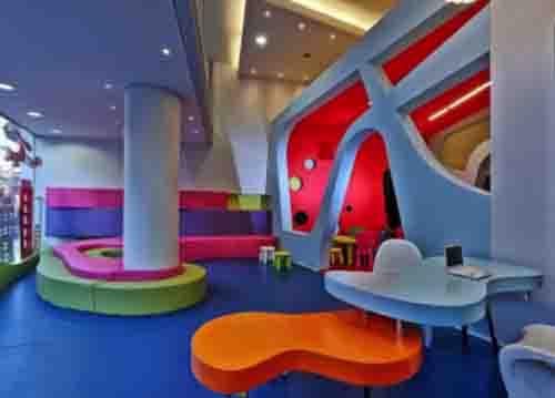 Здание детского сада представленное на следующей иллюстрации имеет оригинальную современную архитектуру. Так же оригинальна и геометрия внутренних помещений. Но, всюду доминирует интенсивный жёлтый цвет, комфортно расположившийся на полу, стенах и потолке. Понятно, что авторы использовали цвет ассоциирующийся с понятиями –«жизнерадостный» и «детский», но насколько приемлемо такое решение с точки зрения психофизиологии? Ответ на этот вопрос мы постараемся дать ниже, в разделе посвящённом особенностям зрительного восприятия детей (а заодно и взрослых).