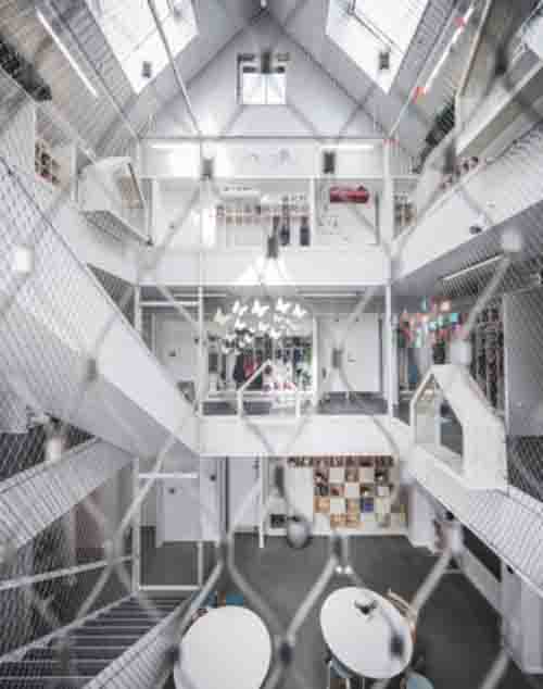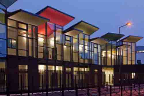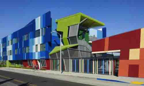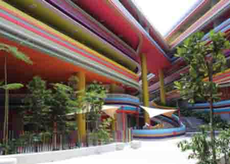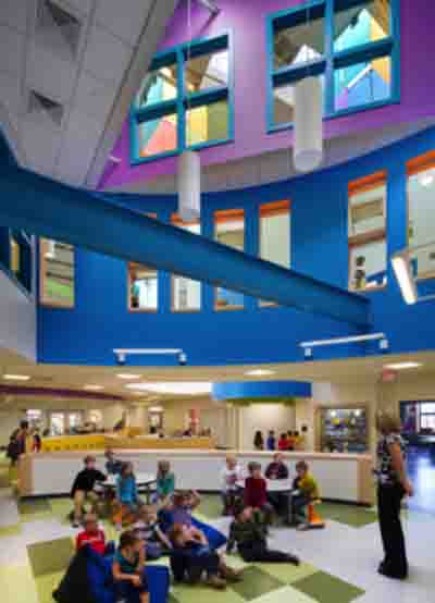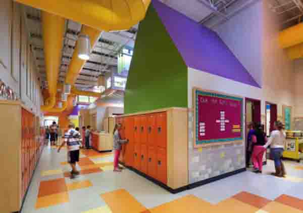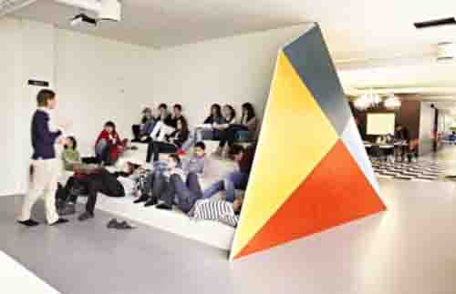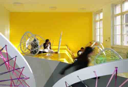 Один из самых ярких примеров новой концепции школьного пространства – школа в Стокгольме. В этой школе есть помещения для групповых занятий, но главную роль играет коридор – универсальное пространство для общения, развлечения, а также индивидуального и группового обучения. Наибольший интерес представляет именно это многообразное, сложное по структуре пространство. Хотя и здесь не избежали ярких «детских» цветовых пятен.