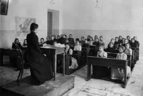 В отличие от домашнего воспитания, при одновременном обучении большого количества детей требовалась жёсткая дисциплина. Поэтому школьное обучение можно назвать «жёстким» вариантом социализации. Соответственно, и обстановка в школах была подчинена идее дисциплины и порядка, что предполагало спартанскую атмосферу, более строгую, чем жилые интерьеры той эпохи – необходимый минимум мебели и отсутствие всяких «излишеств». Никакой игры – только обучение и воспитание.