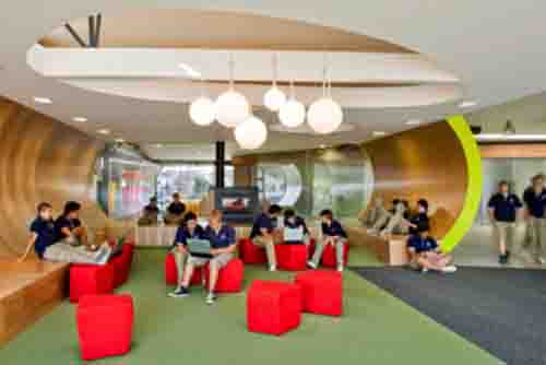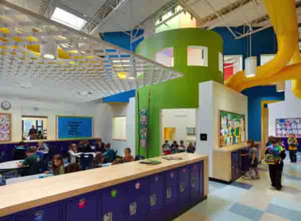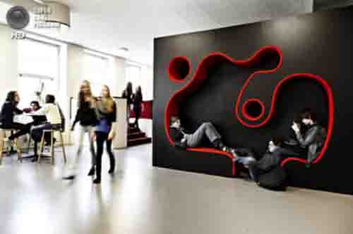 Как для учебных помещений, так и для холлов и коридоров наиболее характерными остаются лаконичные рациональные интерьеры с акцентными цветовыми пятнами. Но, в последние годы все чаще встречаются попытки создать неординарные пространства.
