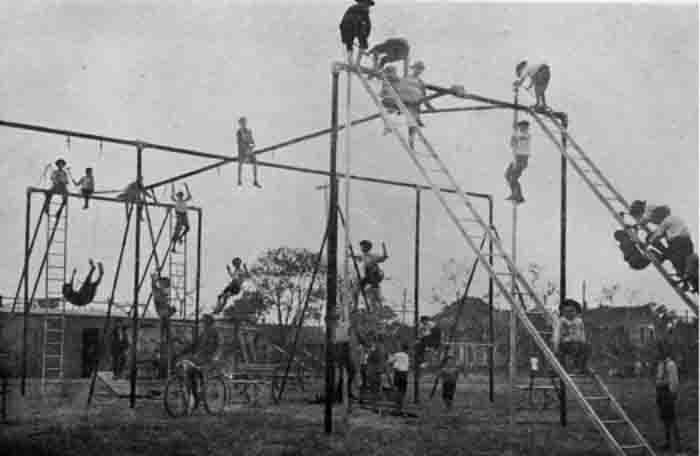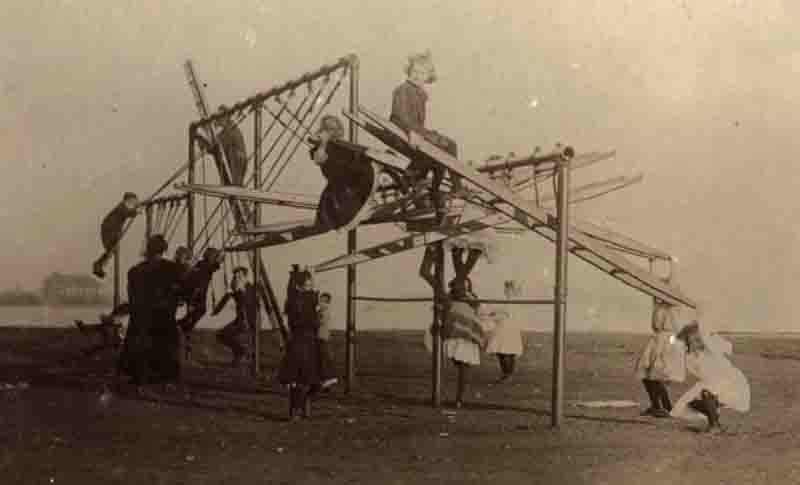 Идея создания специализированной детской игровой площадки сравнительно молода. Развитие промышленности привело к концентрации населения в крупных и средних городах, к появлению больших рабочих кварталов, застраиваемых дешёвыми типовыми домами. Образ жизни в монотонной, тесной жилой среде резко контрастировал с традиционным деревенским укладом. В городе дети и подростки оказались предоставленными сами себе в очень сложной и, в то же время, неприспособленной для них среде. По мере роста стандартных кварталов, росли проблемы. Прекрасный американский снимок очень хорошо передаёт особенности ситуации сложившейся к началу ХХ века практически во всех индустриальных странах.