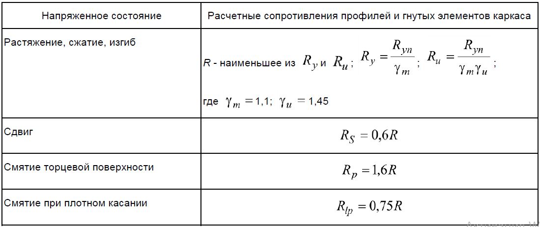 Значения расчетных сопротивлений профилей из алюминиевых сплавов по ГОСТ 22233 и гнутых элементов каркаса по ГОСТ 13726 следует определять по формулам, приведенным в таблице 5.1.8.2.