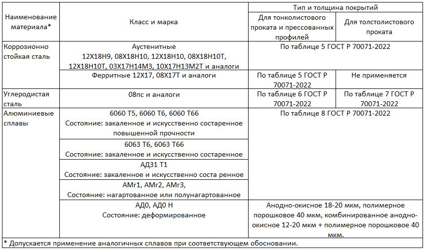При проектировании конструкций НФС из разнородных материалов необходимо предусмотреть меры по предотвращению контактной коррозии согласно ГОСТ Р 70071 2022 (пункт 5.5).
