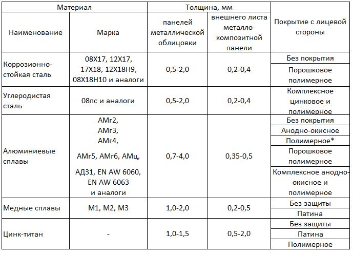 В качестве материалов для изготовления металлических панелей, элементов облицовки и наружных листов металлокомпозитных панелей применяют: коррозионностойкие стали (ГОСТ 4543, ГОСТ 5632, ГОСТ 5582, ГОСТ 5949), углеродистые стали (ГОСТ 9045, ГОСТ 14918, ГОСТ 34180), алюминиевые сплавы (ГОСТ 4784), медь и медные сплавы (ГОСТ 859), цинк титан (ГОСТ Р 58953).
