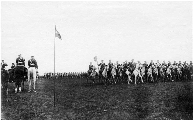 «Начиная от церкви Черниговского драгунского полка шпалерами по обеим сторонам пути выстроены были на лошадях оба полка, причем офицеры, присоединяясь к Царскому поезду, составляли как бы конвой Государя. У подъезда вокзала Его Величество, выйдя из экипажа, снова благодарил гг. офицеров за блестящий смотр и интересовался новой формой летнего обмундирования гг. офицеров, изготовленной ими для похода из рогожки коричневого цвета, не представляющей собой такой верной цели для неприятеля как белые кителя».